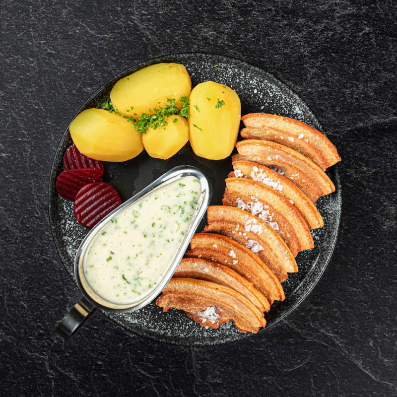Stegt flæsk serveres med kartofler, rødbede og persillesauce.