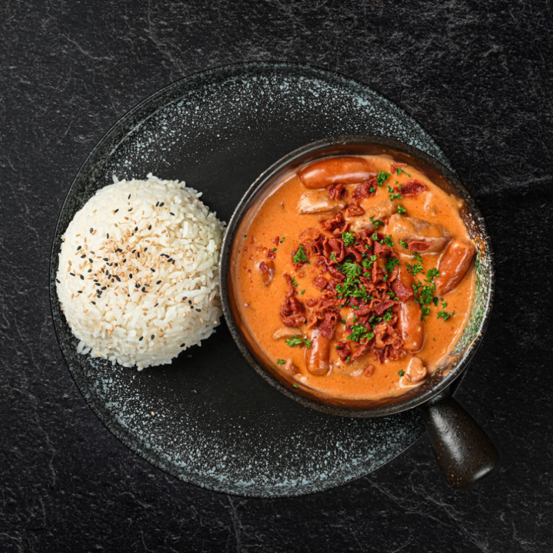 Vikingegryde er en cremet gryderet med svinekød, bacon, cocktailpølser, champignon og paprika i en flødesauce. Serveres med ris.